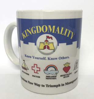 The mug shows off the cover of the successful management book Kingdomality: An Ingenious New Way to Triumph in Management.